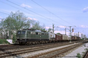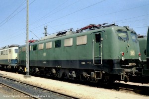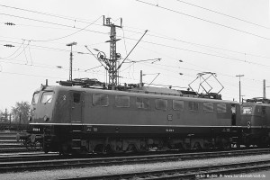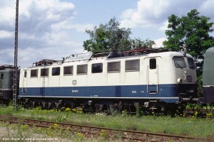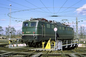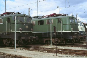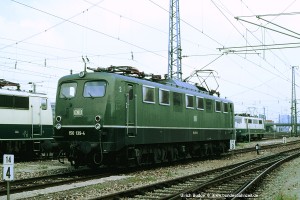 Die ersten E50 besaßen angeschweißte Handläufe beidseits der Einstiegtüren. Ab E50 061 ff wurden verchromte Rohre verwendet, die unten auf einen Dorn gesteckt und oben mit einem Halter am Kasten verschraubt wurden. Eine Umrüstung älterer Maschinen auf diese neue Bauart der Handläufe erfolgte nur bei Bedarf (= notwendige Reparatur), in einigen Fällen auch nur an einer Stirnseite. Aufnahme: 150 055-2 (Stg), München-Berg am Laim, 17.05.88. |
