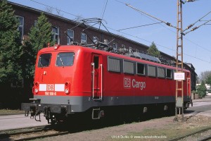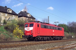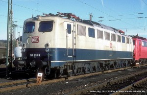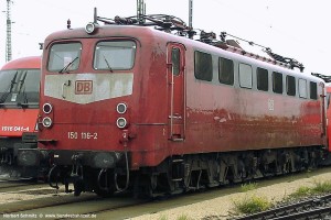 Die ersten drei verkehrsroten 150 entstanden im AW Dessau und hatten ein ganz besonderes Design: Eine etwas tiefer liegende Farbtrennkante zwischen Rot und Grau im Rahmenbereich, silberne Lampenringen und ein rotes Dach (abgesehen von den Hauben), erkennbar auch von unten an den rot lackierten Konsolen für die Stromabnehmer, sowie die frontseitige Nummer generell im roten Bereich. Aufnahme Michael Fuhry: 150 157-6 (Kor), Bw Kornwestheim, 15.03.98. |
