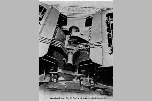 Bis zur 150 164 waren die Drehgestelle untereinander mit einer Vorrichtung gekoppelt, deren Hauptfunktion darin bestand, das Aufbäumen der Drehgestelle bei schweren Anfahrten zu verhindern. Darin integriert war eine gefederte Querkopplung zur Verbesserung der Fahreigenschaften. Nur in Längsrichtung wurden keine Kräfte übertragen. Repro U. Budde |