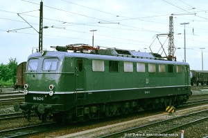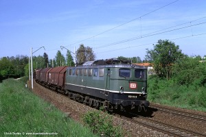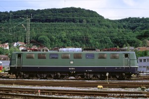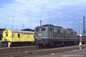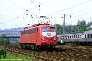 Ab Anfang der 1980er Jahre mussten alle Reisezüge mit einer automatischen Türschließeinrichtung versehen sein. Um die 150 auch weiterhin im Reisezugdienst einsetzen zu können, wurden zahlreiche Loks mit einer Anschlussmöglichkeit an die Hauptluftbehälterleitung nachgerüstet, erkennbar an den vier Bremsschläuchen. Darunter auffallend viele 150 des Bw Kornwestheim bzw. Stuttgart. Aufnahme: 150 055-2 (Stg), Hagen-Hengstey, 25.05.93. |