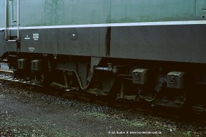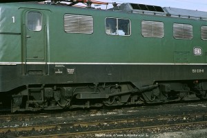 Ab Mitte der 70er Jahre wurde als Sparmaßnahme bei allen 150 die Anzahl der Sandkästen von 8 Stück pro Drehgestell auf nur noch 4 reduziert. Gesandet wurde jetzt nur noch vor dem vorlaufenden Radsatz eines jeden Drehgestells, was sich im Betrieb aber nicht negativ bemerkbar gemacht haben soll. (In gleicher Weise wurde übrigens auch bei der Baureihe 194 verfahren). Aufnahme: 150 124-6 (NüR), Bw München Hbf, 07.09.89. |