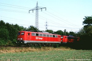 Bei genau 7 Loks leistete sich das AW Opladen eine kleine Eigenmächtigkeit in der Farbgebung: Der Sockel für die Dachhauben wurde ebenfalls in verkehrsrot lackiert. Ansonsten entsprach die Ausführung dem regulären Farbschema. Dazu gehört, dass bei den Loks ab 150 156 die frontseitige Nummer im grauen Bereich platziert war, weil der Platz oberhalb durch die Einlassöffnung für die Führerraumbelüftung nicht zur Verfügung stand. Aufnahme: 150 177-4 (Kor), Bw Oberhausen-Osterfeld, 25.08.01. |