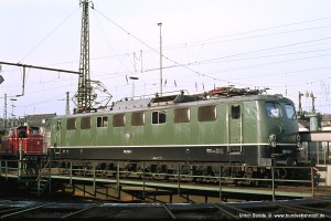 Zur Reduzierung der Spurführungskräfte wurden 150 038 und 042 versuchsweise auf eine geänderte Lokkasten-Abstützung mittels Flexicoilfedern umgerüstet. Gleichzeitig entfiel die Kopplung zwischen den Drehgestellen. Aufnahme: 150 042-0 (NüR), Bw Nürnberg Rbf, 22.05.79. |
