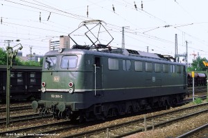 Ab ca. 1989 tauchten vereinzelt Einheits-Elloks mit einem roten DB-Logo auf der Front auf. Ob das dem "corporate identity" Gedanken geschuldet war, oder nur einfach ein Griff ins falsche Fach (Aufkleber für orientrote Loks), ist nicht bekannt. Viele Loks in dieser Ausführung gab es jedenfalls nicht (Nummern siehe Tabelle oben). Aufnahme: 150 113-9 (NüR), Fürth-Unterfarrnbach, 03.05.94. |