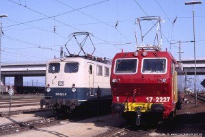Jede Ellok besitzt an beiden Stirnseiten rechts und links Anschlüsse für die Zug-Energie-Versorgung (ZEV), rechts Steckdose, links Kabel mit Stecker – so wurden alle Loks geliefert. Da die Kabel im Frontbereich oft beschädigt wurden, baute man ab Mitte der 70er Jahre auch auf der linken Seite Steckdosen an und führte ersatzweise ein Kabel mit zwei Steckern im Maschinenraum lose mit. Aufnahme: 150 082-6 (Beb), neben NSB EL17.2227, Bw Mannheim, 23.04.87. |