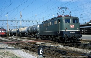 Für einen zeitlich begrenzten Tankzugverkehr zwischen Karlsruhe Rheinhafen und Bettwiesen (im Schweizer Kanton Thurgau) wurden drei 150 des Bw Kornwestheim mit dem Schweizer Zugsicherungssystem INTEGRA ausgerüstet. Da die Strecke von Konstanz via MThB bis Bettwiesen/CH und Wil/CH mit dem regulären deutschen Stromabnehmer DBS54 befahren werden kann, war eine Ausrüstung mit Schweiz-tauglichen Stromabnehmern nicht erforderlich. Aufnahme Werner Brutzer: 150 166-7 (Kor), Wil/CH, 06.09.96. |