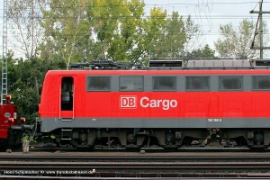 Nur 11 Jahre nach ozeanblau/beige war mit einem neuen Vorstandsvorsitzenden auch ein neues Farbschema fällig: Ab Mitte 1987 galt für alle Neulackierungen: orientroter Lokkasten mit weißem (lichtgrauen) Lätzchen. Bei dieser Gelegenheit erhielten die Loks i.d.R. auch Lüftungsgitter der Bauart Klatte, die anfangs noch unlackiert, d.h. aluminiumfarben, waren. Aufnahme: 150 001-6 (NüR), Bw Nürnberg Rbf, 01.03.95. |