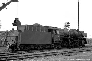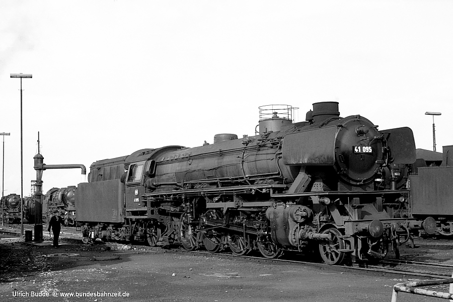 Neubaukessel und Ölfeuerung - das war das Nonplusultra. Deshalb ist es auch nicht verwunderlich, dass die 41 in dieser Bauform zu den letzten bei der DB eingesetzten Dampfloks gehörte. Als 41 095 am 07.10.68 vor Dienstbeginn noch einmal Wasser im Bw Rheine nimmt, hat sie noch mehr als acht Betriebsjahre vor sich. |