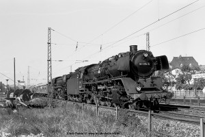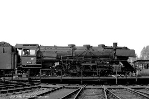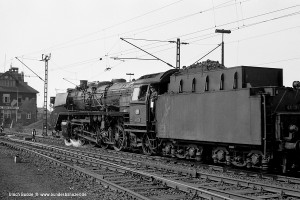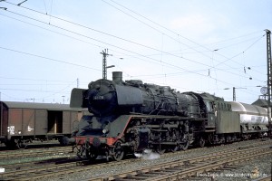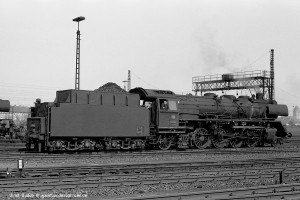 Schon 1½ Monate abgestellt ist 041 101 bei nächsten Wiedersehen am 28.09.69 in Eifeltor. Eigentlich mag ich ja keine Bilder von abgestellten Loks, aber dieses hier belegt zweierlei: Die Lok erhielt noch die neue Nummer, und war außerdem bis zuletzt mit einem 34er Tender gekuppelt. |