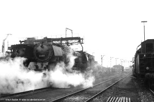 Kurze Zeit später gibt es einen kleinen Bw-internen Einsatz für 41 292: Die (noch) kalte Schwesterlok 41 101 wird zum Anheizen aus dem Schuppen gezogen. Bw Köln Eifeltor, 01.06.68. |