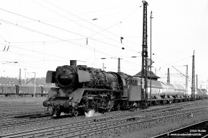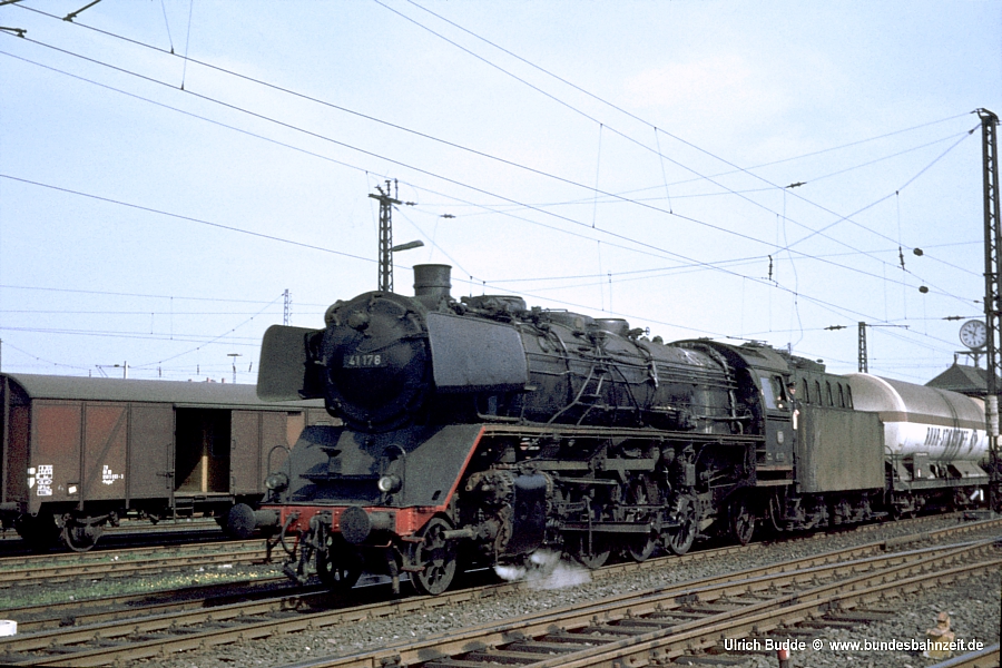Rein zufällig und quasi im Vorbeigehen entstand meine einzige Aufnahme einer Altbaukessel-41 im regulären Einsatz: Am 18.04.68 war ich gerade auf dem Weg ins Bw Eifeltor, als 41 178 mit einem langen Druckgas-Kesselwagen Ganzzug den Rangierbahnhof in Richtung Süden verlässt. Ziel? Vermutlich das Chemierevier zwischen Köln und Bonn. |