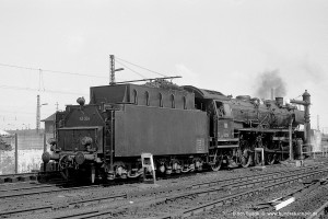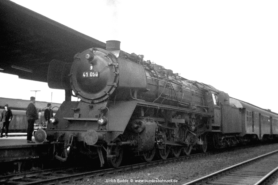 Mein erstes Foto von einer "schönen Mikado" entstand am 04.06.65 bei trübem Wetter mit Einfachstkamera in Bielefeld Hbf. Damals habe ich mir leider keine Notizen gemacht, und so lässt sich heute nicht mehr sagen, welchen Zug 41 058 vom Bw Bielefeld am Haken hat. Die Lok ist übrigens mit dem schönen Tender 2'2'T32neu gekuppelt. |