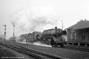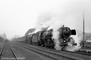 Am 28.09.69 lud der Kölner Eisenbahnclub (KEC) zur großen Mikado Abschiedsfahrt ein, die von Köln über Betzdorf - Haiger zur BLE nach Butzbach führte. Im Siegtal war das Wetter (wie so häufig dort) ziemlich diesig, so dass zunächst nur Bahnhofsaufnahmen möglich erschienen. Im Bf. Schladern warten 041 334 und Neubaukessellok 041 293 auf Ausfahrt. |