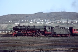 Die letzte Aufnahme der Fahrt zeigt 041 334 + 041 293 mit ihrem E 41052 bei der Ausfahrt aus Dillenburg, etwa in Höhe des Rangierbahnhofs. Jetzt, auf der Hauptstrecke, ist wieder full power angesagt - Hauptbahn-Dampf eben. |