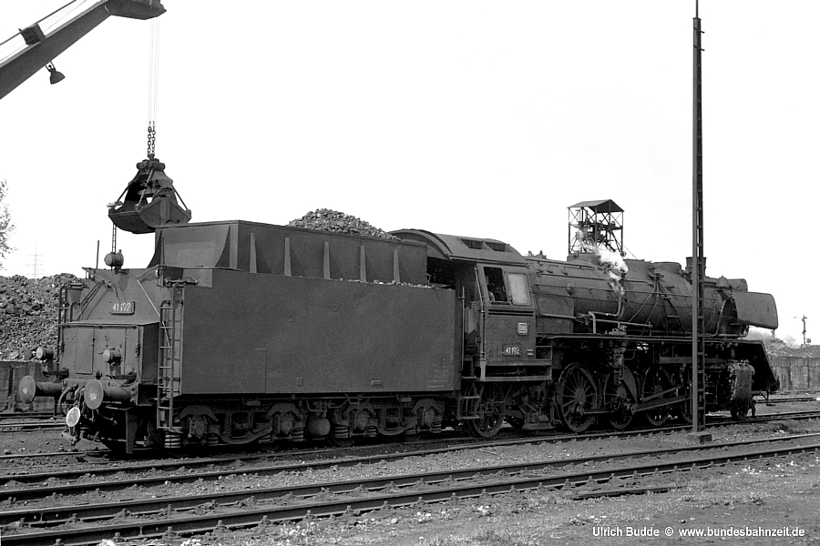 Bw Rheine. Bei meinem ersten Besuch am 22.04.68 wimmelte es hier noch vor Dampfloks, und viele 41 waren natürlich auch dabei. Nur die Altbaukessel-Loks machten sich rar. Viel zu spät wurde die ankommende 41 192 bemerkt. Einmal längs durch das ganze Bw geeilt und eine Aufnahme von hinten beim Bekohlen gemacht, dann war der Film voll - Anfängerpech. |