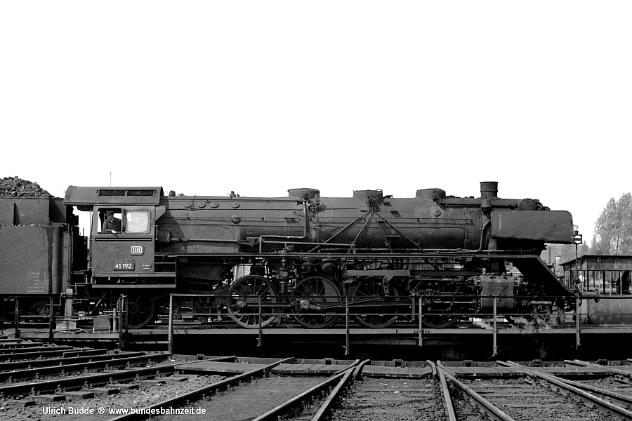 Bis der neue Film eingelegt war, war die Lok bereits auf der Drehscheibe und gerade dabei, sich in den Schuppen zu verziehen. Da blieb nur noch Zeit für einen Notschuss von der Seite. 41 192 auf der Drehscheibe des Bw Rheine am 22.04.68. |