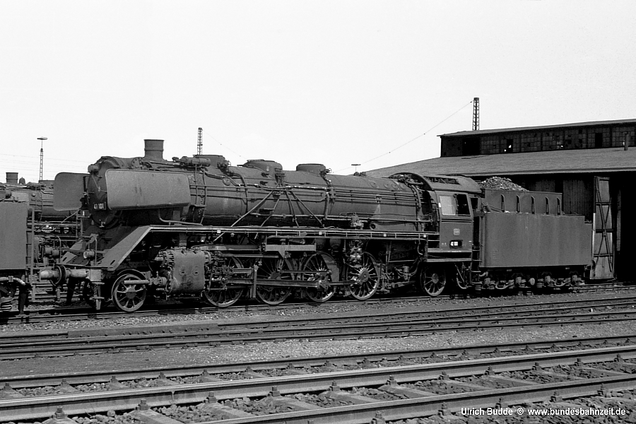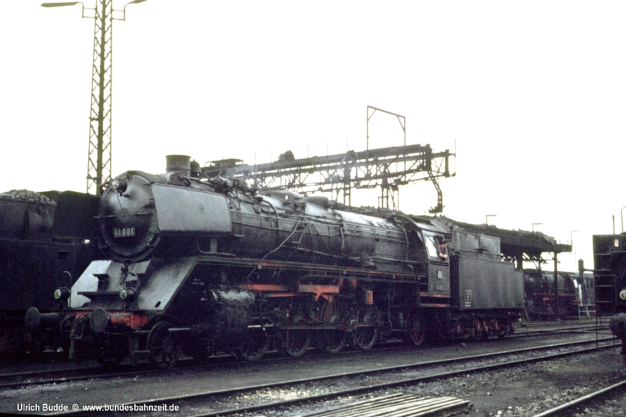 Das Porträt der schönen Mikado. Als am 20.06.67 das Wetter endlich ein wenig sonniger wird, steht 41 001 schon eingekeilt zwischen anderen Loks und es ist nur noch eine Frontal-Ansicht möglich. Aber besser so als gar nicht. Und heute freue mich darüber, ist es doch meine einzige Porträtaufnahme einer 41 AK. |