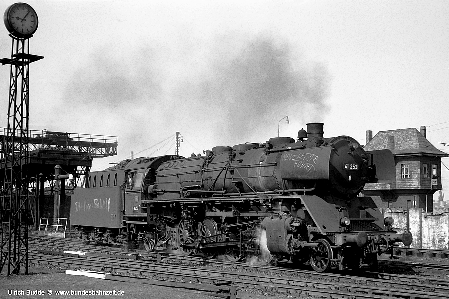 Nachdem Wasser und Kohle gefasst sind, dampft 41 253 am 01.06.68 zu ihrem nächsten Einsatz. Am Windleitblech und Tender steht "Meine letzte Fahrt"; fragt sich nur, wohin? Auf die Lok selbst kann sich das nicht beziehen, denn ... |