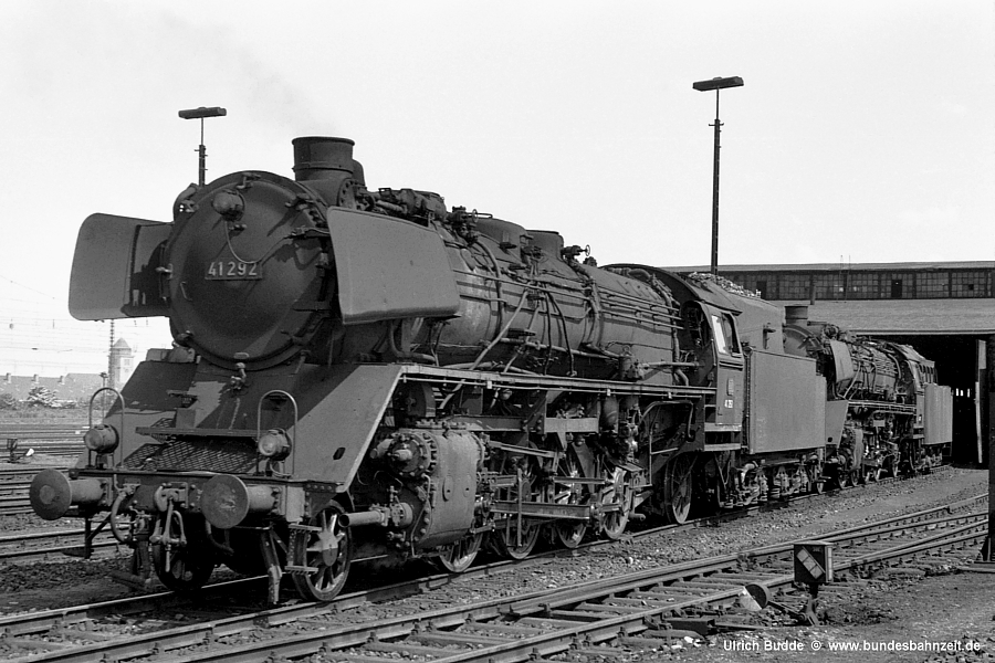Als zweite Eifeltorer Altbaukessel Mikado konnte 41 292 mit einem 2'2'T32neu aufwarten. Am 01.06.68 posiert sie vor dem Eifeltorer Rechteck-Schuppen. |