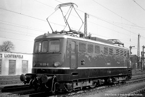 Lichtenfels, 05.04.69. Im Bahnhofsvorfeld präsentiert sich 110 005 in einem Top- Zustand dem Fotografen. Günstige Bedingungen für ein klassisches Typen-Bild. Auch sie ist mit dem SBS 49 ausgerüstet, der allerdings inzwischen mit einer Wippe mit Doppelschleifleiste (Dozler-Wippe wie DBS 54) versehen ist - daher die Bezeichnung SBS 49/54. |