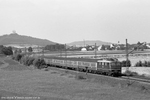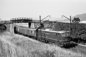 Im Sommer 72 achtete man schon genauer auf die Einsätze der 110.0. Und so waren wir rechtzeitig zur Stelle, d.h. auf einer kleinen Straßenbrücke südlich von Staffelstein, als 110 001 mit E1639 gen Nürnberg rauscht. 06.08.72. Hoch oben auf dem Berg im Hintergrund thront das ehrwürdige Kloster Banz über dem Tal. |