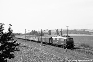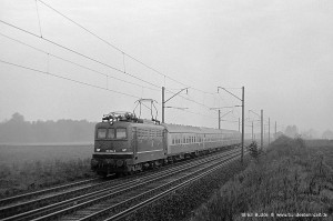 Am frühen Morgen des 19.09.76 liegt noch zäher Bodennebel über den Auen längs der Regnitz bei Großgründlach, nördlich von Fürth. Gerade noch rechtzeitig klart es ein wenig auf, als 110 004 mit ihrem E3511 aus dem Dunst auftaucht. Während das Farbdia mangels Kontrast und Farbe unbrauchbar ist, bringt das Schwarz/weiß-Foto die nass-kalte Stimmung m.E. ganz gut rüber. |