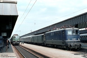 Eine Lok fehlte bisher in dieser Galerie; die E10 004. Ausgerechnet die erste E10.0, die ich überhaupt zu Gesicht bekam, war die letzte, die ich aufs Celluloid bannen konnte. Endlich, am 29.08.76 war es soweit: In Fürth Hbf steht 110 004 vor E3511 aus Coburg. |