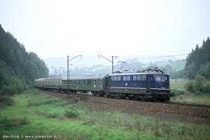 Der einzige hochwertige Zug im Umlaufplan Sommer 1976 war D402, der von Nürnberg bis Probstzella gefahren wurde. Am 20.09.76 hat 110 004 die Aufgabe, diesen Zug zu bespannen; hier bei Rothenkirchen am Fuß der Frankenwaldrampe bei (zumindest für meine Reisen) typischem Frankenwaldwetter. |