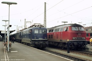 Gut 2 Stunden später hatte 110 005 ihren nächsten Einsatz: E1914 nach Coburg. Auf dem Nebengleis sieht man 140 852 mit P4231 nach Schwabach, ein typischer Einsatz für die Nürnberger 140.7 zu jener Zeit. Großmutter und Enkel ein und derselben (Lok-) Familie. Nürnberg Hbf, 03.06.73. |