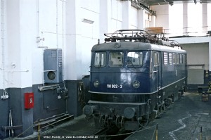 Diese Aufnahme markiert den Übergang vom Betriebsdienst zur Museumslok. Zwar ist 110 002 noch im Einsatzbestand, aber am 25.09.76 ist sie mal wieder schadhaft im Ellok-Schuppen des Bw Nürnberg Hbf abgestellt. |