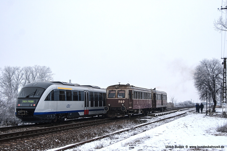 Bei einer Probefahrt von Arad nach Oradea gab es im Bahnhof Zerint eine Zugkreuzung mit einem Regelzug, für den die CFR einen alten Malaxa Triebwagen einsetzte. Leider herrschten an diesem Wintertag wahrlich unterirdische Lichtverhältnisse. CFR 96-2620 und 77-0989 am 19.12.07. Dank für den tollen Beitrag und einen schönen Tag noch, Ulrich B. |