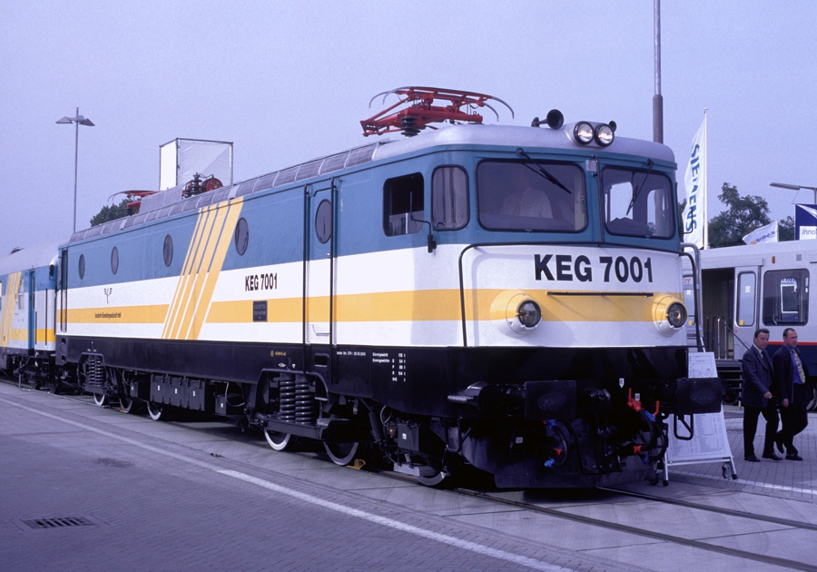 Auf der INNOTRANS 2000 in Berlin fotografierte ich bei meinem Besuch am 12.09. die KEG 7001, ex CFR 40-0079. Wenn ich mich recht erinnere, sollte die 50 Hz Maschine auf 16 2/3 Hz umgebaut werden, was mir schon damals ziemlich unrealistisch erschien. |