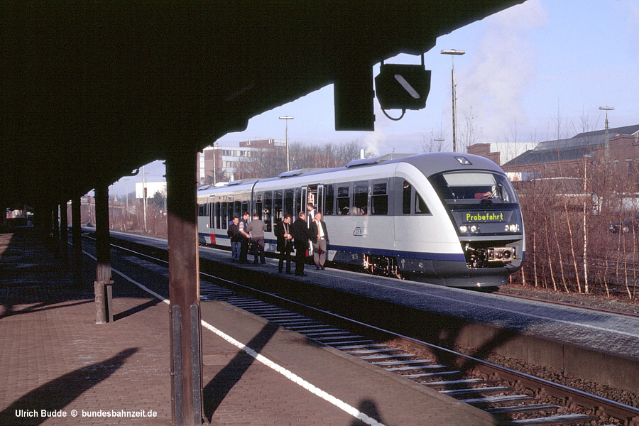 Die 60 vorlaufend in Uerdingen gefertigten Züge boten natürlich reichlich Gelegenheit, sich schon einmal mit den Fahrzeugen und ihrer Fertigung vertraut zu machen. Und da ich bis dahin noch nie mit einem DESIRO VT gefahren war, war ich schon bei der Werksprobefahrt des zweiten Zuges mit an Bord, um erste Erfahrungen (im wahrsten Sinne des Wortes) mit meinem neuen Projektgegenstand zu sammeln. Hier also CFR 96 2002, der A-Wagen des 2. Zuges, in Kleve am 16.12.02. |