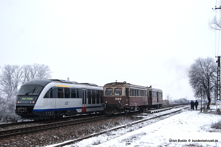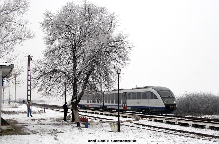Auch in Rumänien konnte ich an einigen Probefahrten teilnehmen. Trübes Winterwetter herrschte am 19.12.07, als es mit dem letzten Zug des Auftrags nach Oradea ging. In Zerind (ca. 60 km nördlich von Arad) mussten wir an die Seite, um einen Gegenzug auf der eingleisigen Strecke kreuzen zu lassen. Genügend Zeit für ein paar Aufnahmen. Zunächst mit Blick auf den vorlaufenden A-Wagen 96-2120. |