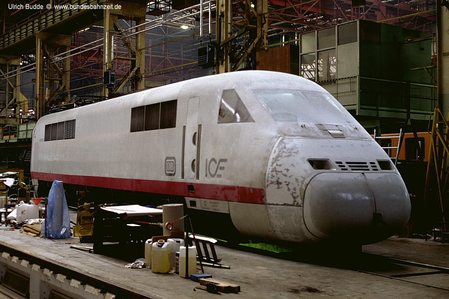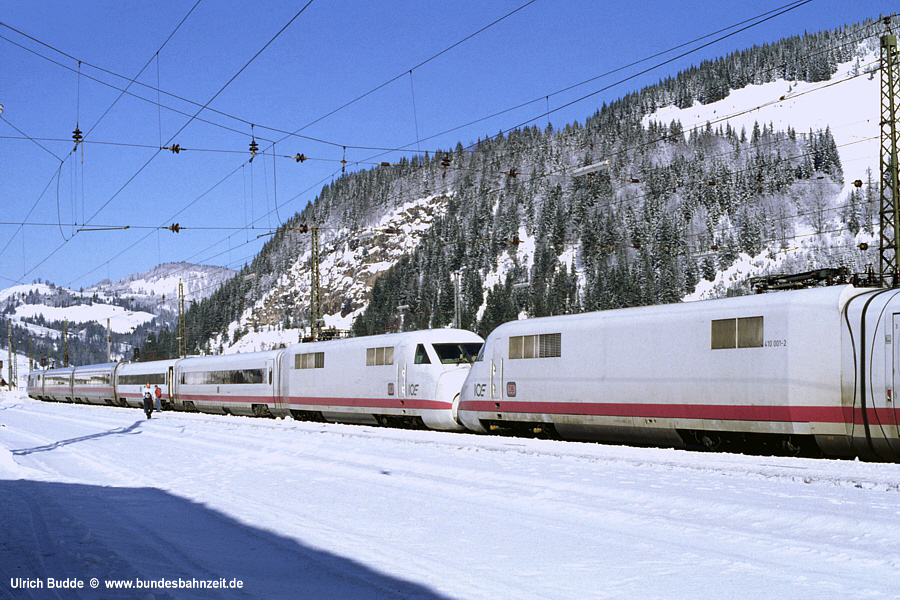 Etwas näher heran und nur den vorderen Zugteil ins Bild genommen kommen jetzt auch die beiden ICE/V Triebköpfe 410 001 und 410 002 zu ihrem Foto. |