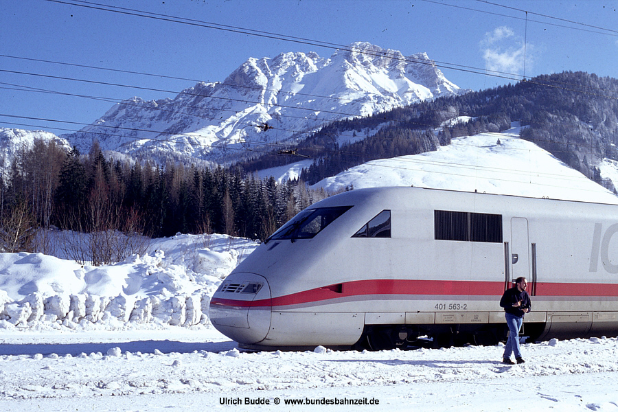 In Hochfilzen hatten wir den Scheitelpunkt der der Strecke mit 970 m.ü.A. erreicht. Hier war ein weiterer, diesmal längerer Betriebshalt vorgesehen. Lokführer U. Baum, mit dem ich im April 1988 die 400 km/h Fahrten gemacht hatte, vertritt sich derweil ein wenig die Beine. |