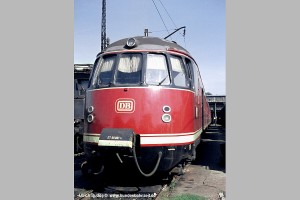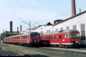 Aus Regensburg war ET26 003 ins AW Bad Cannstatt gekommen. Die Abstellung auf Hilfsdrehgestellen im Außenbereich deutet darauf hin, dass größere Arbeiten am Triebdrehgestell und/oder den Fahrmotoren vorzunehmen waren. Dieser Triebwagen entstand 1957 durch Umbau aus dem Isartalbahn ET182 21 (ex S-Bahn Berlin ET165 636), bei dem der Wagenkasten eine komplett neue Kopfform erhielt. |