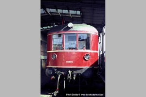 Nächstes Ziel war Bad Cannstatt, wo sich das damals einzige Ausbesserungswerk für E-Triebwagen (außer S-Bahn) im Bereich der DB befand. In einem Top-Zustand präsentiert sich der Tübinger ET56 005a. Die ursprüngliche Farbgebung mit den schwarz hinterlegten Frontfenstern und dünnen Zierstreifen steht dem Triebzug ebenso gut wie seinem Nachfolger, dem ET30 (siehe hierzu Galerie "ET30 – Der Ruhrgebietssprinter"). |