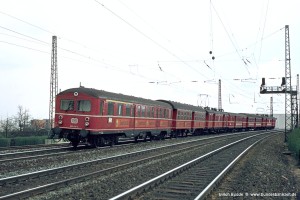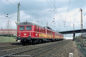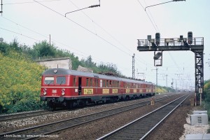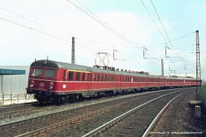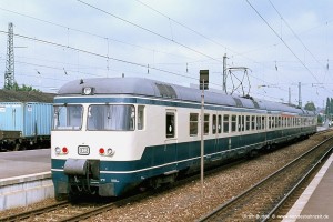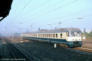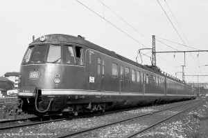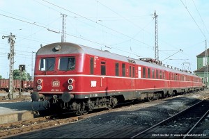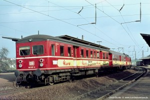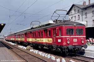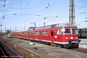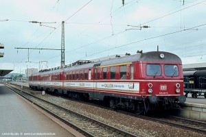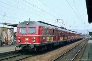 Der ET25 001 war allerdings weder in Erst- noch in Zweitbesetzung wirklich der erste ET25. Das war vielmehr der 1935 in Dienst gestellte Triebwagen mit der DRG Nummer elT 1801, der ab 1941 als ET25 015a/b bezeichnet wurde und heute noch als Museumszug vorhanden ist. Hier verlässt er Stuttgart Hbf am Schluss einer ET25-Doppel-Einheit, vermutlich als E4861 nach Bietigheim. |
