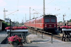 Die Rückansicht auf 455 408 zeigt, wie man es in der Bundesbahnzeit verstand, mit geringem Aufwand ein ansprechendes Erscheinungsbild zu erzeugen: Blumen-kästen auf den Prellböcken und Blumenkübel sorgen für ein einladendes Ambiente. P5462 im Bf. Nördlingen, 15.07.77. |