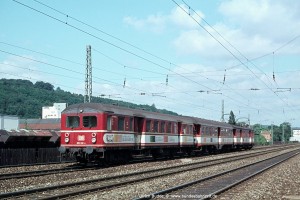 Ein weiterer besonderer Steuerwagen war 865 632, der 1960 im Zuge der Generalüberholung aus EB51 01 entstand. Gegenüber den "normalen" ES65 besitzt er eine geringfügig andere Aufteilung der Fenster, einen kleineren 1. Klasse-Bereich und ein etwas tonnenförmigeres Dach. Am 19.07.77 ist er zusammen mit 865 017 und 465 017 als P 6228 bei Oberesslingen auf dem Weg nach Stuttgart. |