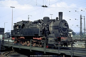 An der hinteren Drehscheibe konnte am gleichen Tag 94 892 auf den Film gebannt werden. Ungünstig stehende Masten und sonstiges Gerümpel zwangen mich dazu, die Lok ziemlich "saugend" ins Bild zu nehmen, was ich aus heutiger Sicht etwas bedauerlich finde. |