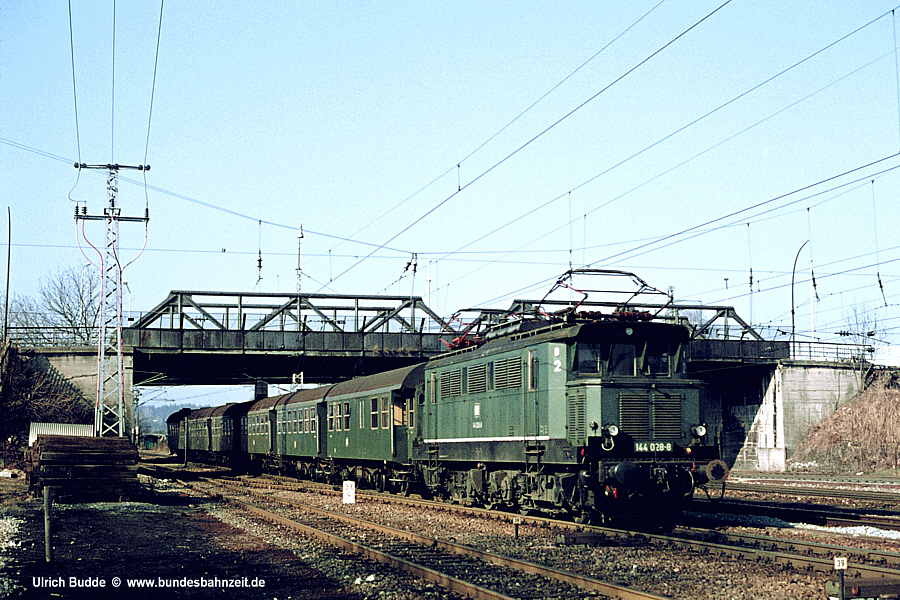 Nach Auflösung des 144er Bestands beim Bw München Ost erhielt Freilassing im Sommer 74 überraschend wieder einige dieser Loks zugeteilt. Der Grund dafür lag in der nicht ausgelasteten Werkstatt in Freilassing, während die Einsätze ausschließlich von Rosenheim aus erfolgten. So tat zum Beispiel die Freilassinger 144 028 am 02.02.75 Dienst auf der Strecke nach Holzkirchen, von wo aus sie gerade mit dem Pz 6217 wieder nach Rosenheim zurückkehrt. Die Fotostelle am Westkopf des Bahnhofs war schon in Bild 1 zu sehen. |
