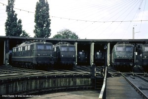 Gut drei Jahre sollte es bis zum nächsten Besuch des Bw Nürnberg Rbf dauern; und inzwischen standen die (Altbau-)Elloks gleichermaßen im Fokus des Fotografen wie die Dampfloks. Vor dem Ellok-Schuppen: 194 124-3 (Aug), 194 013-9 (NüR) und 139 555-7 (Beb). |
