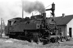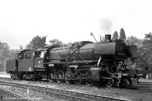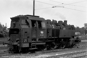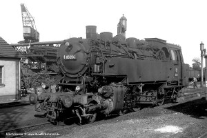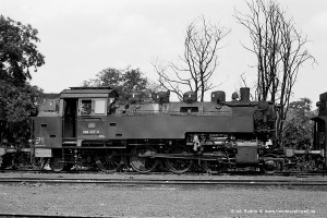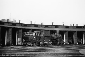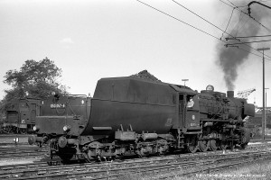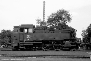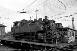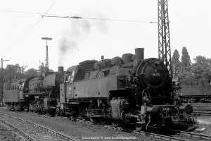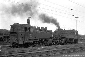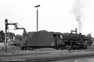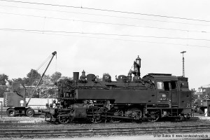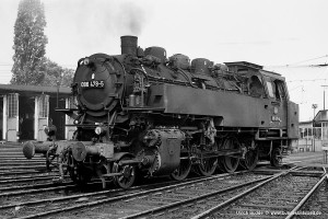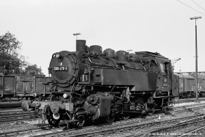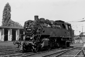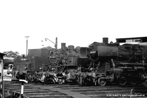Nur vorübergehend kalt abgestellt war 086 457-9. In ihren letzten Betriebsjahren präsentierte sich diese Maschine mit einem geschweißten Altbau-Wasserkasten und Scheibenrädern vorn und hinten. Erst bei ihrer Aufarbeitung als Museumslok erhielt sie einen Neubau-Wasserkasten und Speichenräder in Laufradsätzen. |
