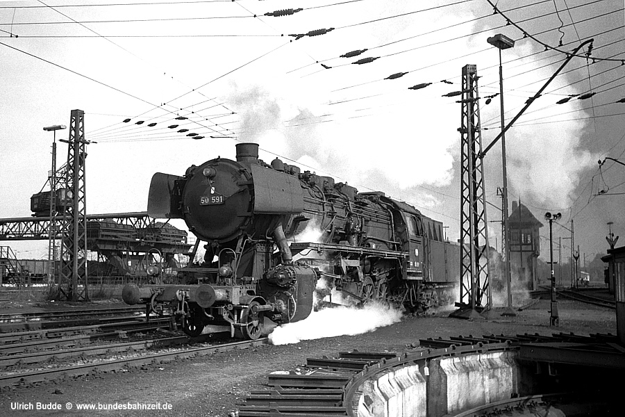 Das Gleiche galt für 50 591, einer Lok mit Behelfs-Führerhausentlüftung, die hier mit Volldampf an der Drehscheibe des Ellok-Schuppens vorbei rauscht. Im Hintergrund die imposante Bekohlungsanlage des Bw Rbf. |