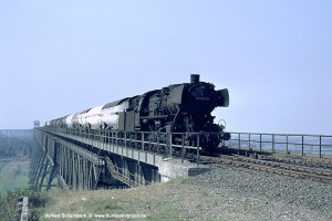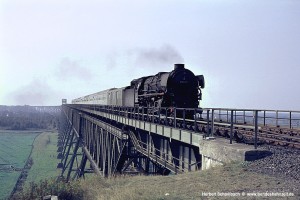 Für den ersten Nordfahrer traute sich der Fotograf sogar ein kleines Stück auf die Brücke hinauf – eine Position, wie sie heute aus vielerlei Gründen undenkbar wäre. Schon lange vorher war der harte Auspuffschlag der 012 zu hören, obwohl 012 080 mit dem kurzen E1701 keine allzu große Mühe gehabt haben dürfte, die Rampe hinauf zur Brücke zu bewältigen. |