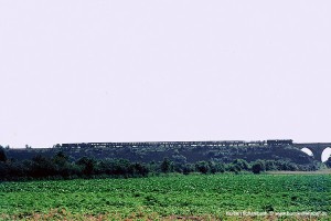 Von der westlichsten der drei Brücken geht der Blick über die gesamte 90° Kurve, mit der die Marschbahn unmittelbar vor dem Bahnhof St. Michaelisdonn von der Neubaustrecke über die Hochbrücke in die ursprüngliche Streckenführung über Brunsbüttel einschwenkt. Am 02.08.71 müsste es der D532 sein, an diesem Tag mit 012 061 bespannt. |