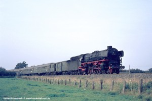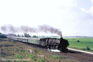 Am 16.09.69 begann der nächste Foto Tag mit ein paar Aufnahmen in Struckum, wo es damals noch einen richtigen Bahnhof an zweigleisiger Strecke gab (heute ist die Marschbahn hier auf ein Gleis zurückgebaut und Struckum besitzt nicht einmal mehr einen Haltepunkt). Den Auftakt machte 012 105-3 mit einem langen Zug aus Altbauwagen. Um etwa 8:00 Uhr morgens käme der Ferneilzug E576 nach Trier in Betracht; der Wagenpark spricht allerdings mehr für einen Sonderzug. |