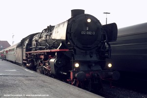 Kurze Zeit später folgte 012 081 mit einem bemerkenswert kurzen, nur aus zwei Wagen bestehendem Zug. Zeitlich könnte es sich um den Pz 2740 gehandelt haben, der allerdings nicht im Altonaer Umlaufplan für die Baureihe 012 enthalten ist; möglich wäre auch ein spontaner Diesel-Ersatz Einsatz? |